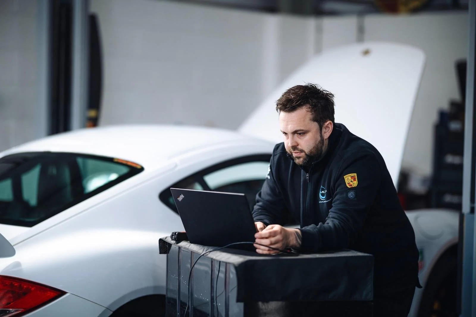 Miltech Porsche Technician, Jamie - carrying out essential Porsche diagnostics